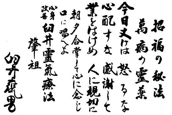 [6] Nasce nel 1865 in un villaggio tra le montagne del Giappone. Grande studioso e ricercatore spirituale che si sostiene abbia ottenuto l’illuminazione durante una meditazione di 21 giorni sul Monte Kurama, e conseguentemente deciso di fondare L’Usui Reiki Ryoho nel 1922. Muore solo pochi anni dopo dalla fondazione del sistema nel 1926, senza purtroppo lasciare adeguate documentazioni scritte riguardo il suo operato.